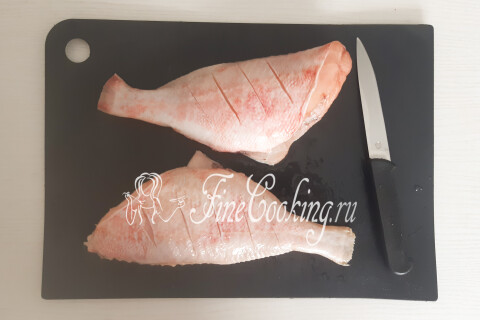 Как правило, в продаже можно найти тушки морского окуня уже без головы, но с внутренностями. Их мы тоже убираем, подрезая брюшко, не забывая удалить черную пленку. Еще раз промываем рыбу и обсушиваем.